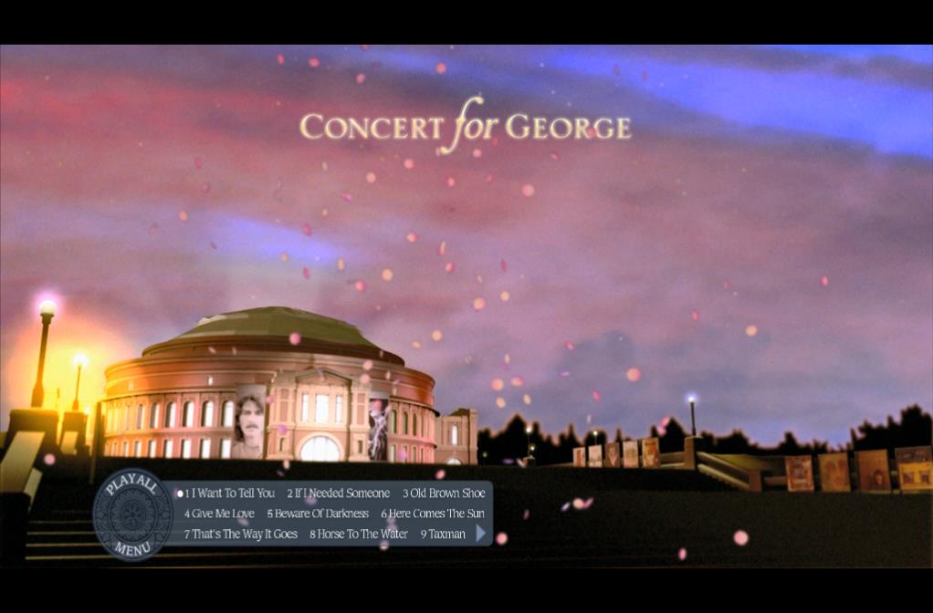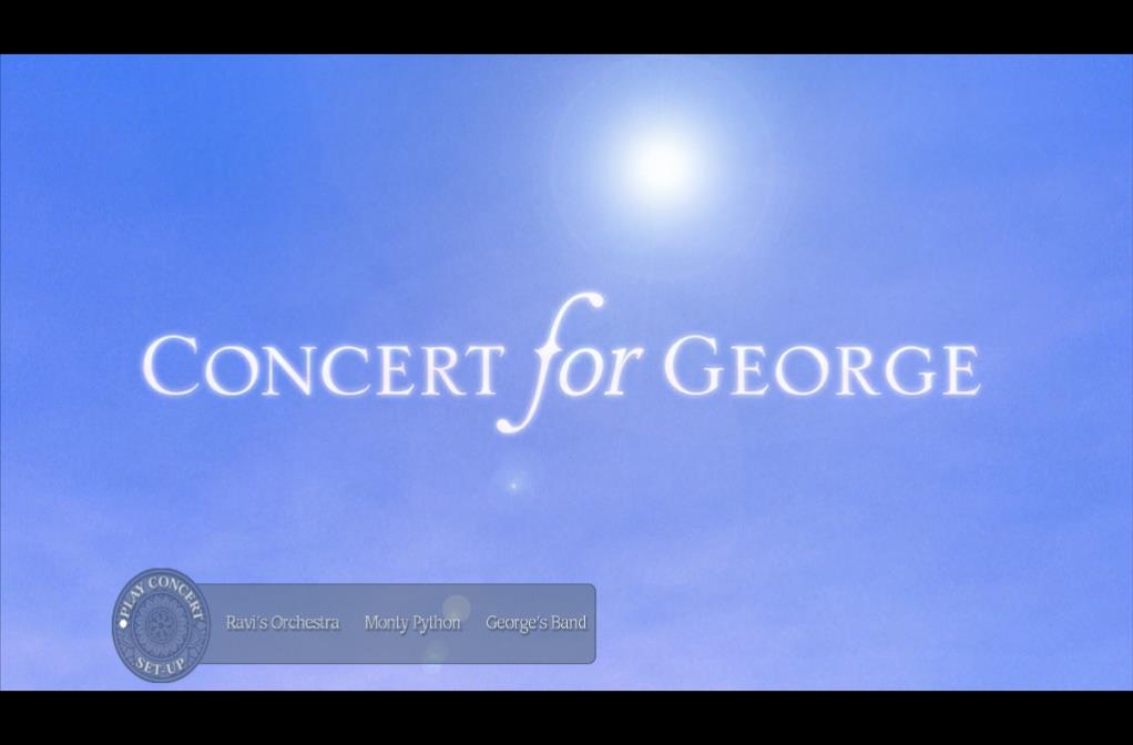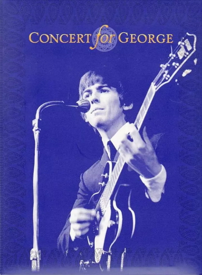 2002 年11月,在George Harrison逝世一周年的时候,由George的遗孀Olivia和儿子Dhani组织,Eric Clapton和Jeff Lynne主导举办了一场纪念他的音乐会,这就是Concert for George。这场音乐会云集了George生前的诸多好友,比如前面提到的慢手普顿和Jeff Lynne,比如Tom Petty和Billy Preston这对老顽童,比如Andy Fairweather-Low这个在无数演唱会现场都能发现的老家伙。当然,Beatles剩余的两位成员也都亮相出席。除此之外,还有George的印度籍朋友:Ravi Shankar一家子。演唱会分成上下两场,上半场主要就是Shankar专门为此次音乐会所做的器乐作品;下半场是George各个时期的作品。在中间休息阶段,英国著名的喜剧表演团体Monty Python插科打诨胡闹一阵,也挺好玩。值得一提的是Tom Hankes也在其中客串一把,虽然镜头一直没怎么给到这个大牌演员。Hankes和George的关系挺不一般,George去世后被好莱坞看中,留名星光大道时,Hankes就在现场。音乐会的上半场挂着George单飞后的大幅照片,就是那张极为有名的留着小胡子长发的照片。下半场的音乐会换了张照片——是不是很神奇?很少有音乐会能这么干——这次的照片更有名,是Beatles时期George抱着吉他站在话筒前的那张,这张照片也是这次演唱会的封面。