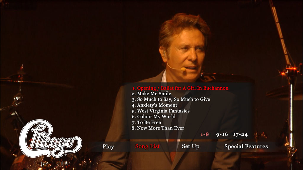 • Interview (HD, 1080i; 1.78:1; 40:54): Loughnane, Pankow and Lamm talk about the band, its origins and its long, eventful career. Their comments on the late Terry Kath are restrained but moving, and they discreetly avoid discussing Peter Cetera. Guitarist Keith Howland, who grew up attending Chicago concerts, then joined the band after the death of founding member Kath, is interviewed in a separate group with other “new” members Jason Scheff, Tris Imboden, Lou Pardini and Drew Hester.