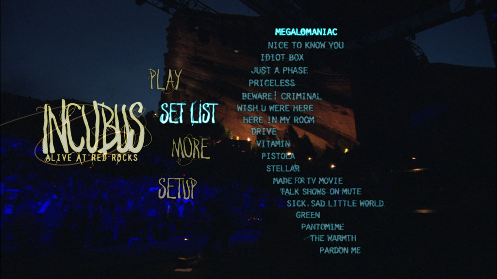 Incubus’s Alive At Red Rocks features the band’s first long-form live concert. Taped at the legendary Colorado Red Rocks Amphitheatre July 26, 2004, Alive at Red Rocks captures the band at its inspirational, gusty best. Opening the show with their 2003 hit single “Megalomaniac”, the band proceeds to rip through tracks from all of their albums including “Talk Shows On Mute”, “Drive”, “Stellar”, and “Vitamin”. The set closes with “Pardon Me” which reached #3 on the Billboard Modern Rock Tracks chart. Building on the DVD release extras, this Blu-ray includes lyrics, a high definition photo gallery, and the ability to focus in on individual band members through the “Navigate the Stage” feature. This package features 5 bonus audio tracks which are included both on the Blu-ray Disc as well as CD. Overall, Alive at Red Rocks is a memorable music release for collectors, fans and people new to the band.