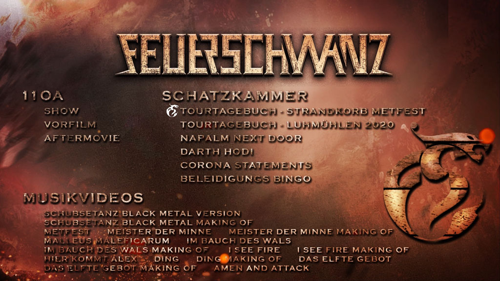 The German Middle Ages/folk rockers FEUERSCHWANZ prevail against any pandemic paralysis and release two virtual live highlights from the past months, summarized under the banner Die Letzte Schlacht, as BluRay/DVD/CD on 6 August via Napalm Records. The bundled live power including some extras, such as the insult bingo á la FEUERSCHWANZ or a tour diary, will be available as a limited edition Wooden Box, Mediabook, LP Gatefold and digital.