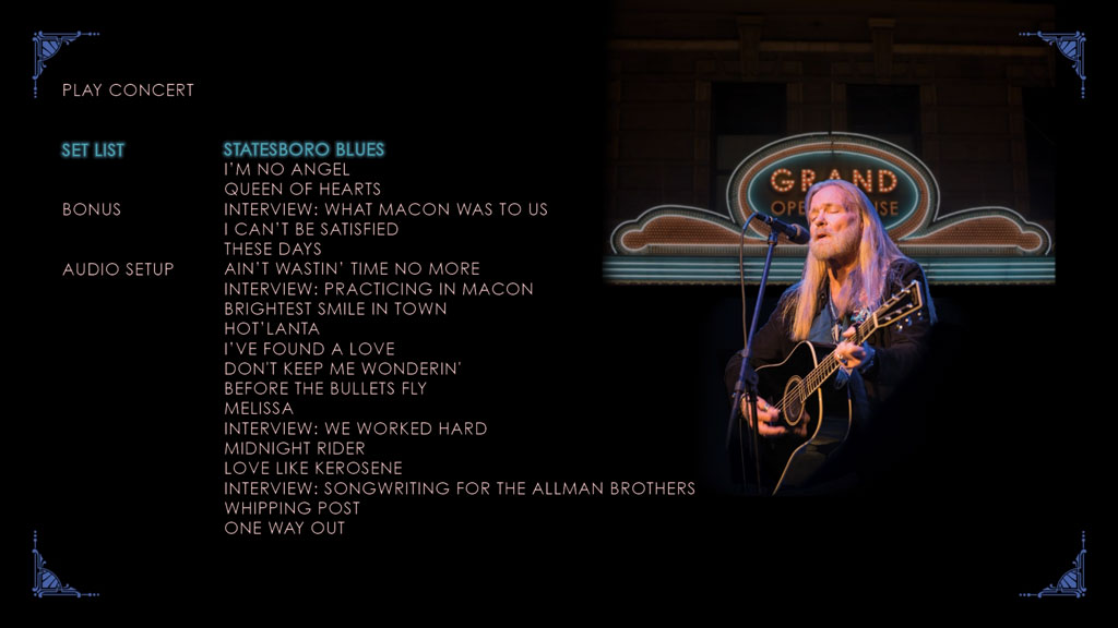 Gregg Allman Live: Back to Macon, GA features sixteen tracks, made up of a nicely-varied selection of songs from the ABB catalog, (“Statesboro Blues,” “Melissa,” “Whipping Post”) tunes from Allman’s solo albums, ( “Queen of Hearts,” “I’m No Angel”) and several dynamic cover songs. The Blu-ray will include two bonus tracks, as well as special interview segments.