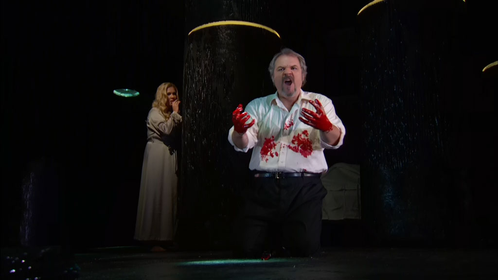 Who would have thought the old play had so much music in it? Unjustly considered one of Verdi’s second tier operas (just below his other Shakespearean operas, Otello and Falstaff), Macbeth nevertheless boasts excellent duets, solos, and several well-timed ensemble pieces. Yet it is rarely performed and even more rarely recorded. A film version (1987) transferred to DVD (2007) with Shirley Verrett and Leo Nucci is eminently splendid, with its simian topless witches (acrobats perhaps?), a musty Godfrey of Bouillon castle, and lots of blue-gray lighting. It set the bar very high, but lately it’s begun to creak in this age of HD and RF mikes.