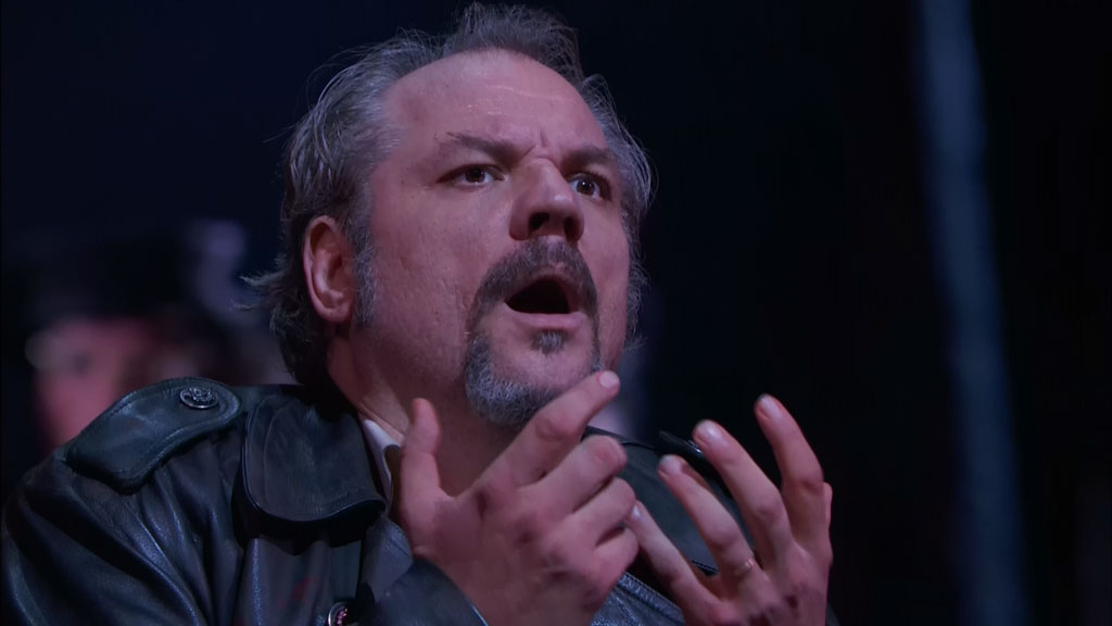 As Macbeth, Zeljko Lucic does a decent job, particularly at the beginning as he totes his AK-47 and milks the witches for info. His baritone voice blends with René Pape’s bass in the ominous aria “Due vaticini.” Of course the real drama occurs later, when Anna Netrebko’s Lady Macbeth sings her double aria “Vieni! t’affretta” – you’re hooked unless you have ice water in your veins. She’s become voluptuous in recent years and the wardrobe department has put that to good use. She’s a bleached blond this time, perhaps a tribute to Lana Turner in The Postman Always Rings Twice (1946), also about a woman inciting a man to commit murder. Her singing is consistently dramatic, and her acting veers towards excess but never quite plunges into it. Their interactions with each other are riveting, both alone and in the public hall where Macbeth sees Banquo’s ghost. Unlike Verrett, who sang both soprano and mezzo-soprano roles, Netrebko’s range is not so broad. Yet her rendition of “Una macchia” (“Out, damned spot”) is easily her best scene in the opera. Considered one of the young Verdi’s best solo creations, this aria is performed under a swinging lamp, which she snatches up as a prop. As she veers from madness to lucidity, you may consider playing this scene again and again. It helps that Luisi’s orchestral accompaniment is flawless. The sound is much better in this Blu-ray version than the older filmed version – how could it not be?