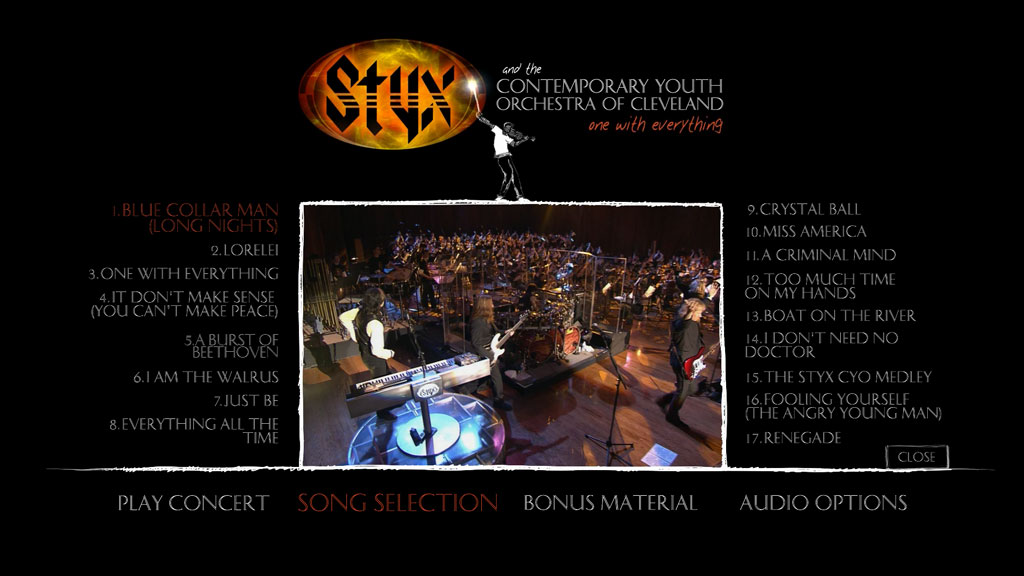 One with Everything is concert video by the rock band Styx, which was recorded and professionally filmed in Cleveland, Ohio during their 2006 tour. The band played with the Contemporary Youth Orchestra, playing a set of 16 songs, including three songs from their 2005 studio album Big Bang Theory. Both an album and a DVD were released, with the Blu-ray Disc on April 29, 2009.