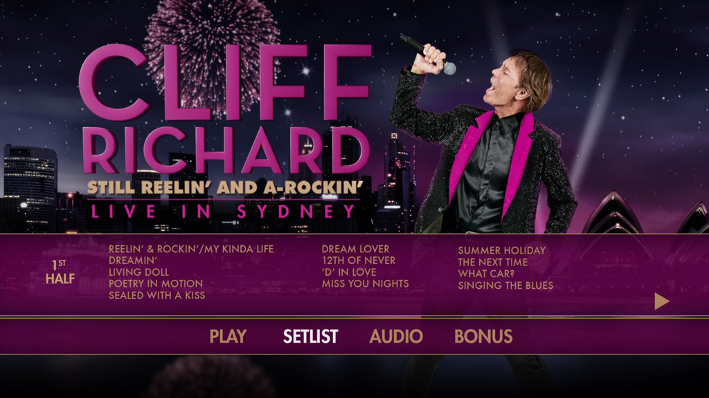 Cliff Richard is one of the most successful British singers of all-time with hits throughout his career from the fifties to the present day and global album sales estimated at 250 million. This latest concert film was shot in Sydney, Australia on the” Still Reelin ‘And A-Rockin’ Tour” in early 2013 . It features classic hits from across Cliff’s career with a focus towards earlier material and also mixes in some classic rock n roll songs. Cliff Richard remains a consummate live performer with an energy that belies his age and a voice that remains in as fine a form as ever. This is yet another live show that will delight his legions of fans.