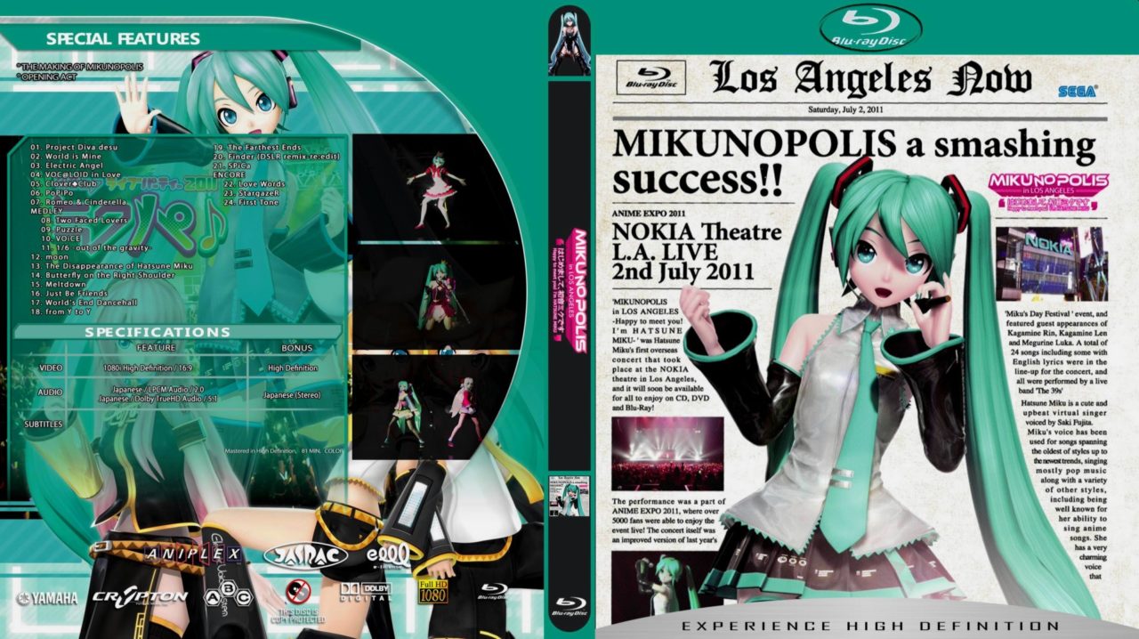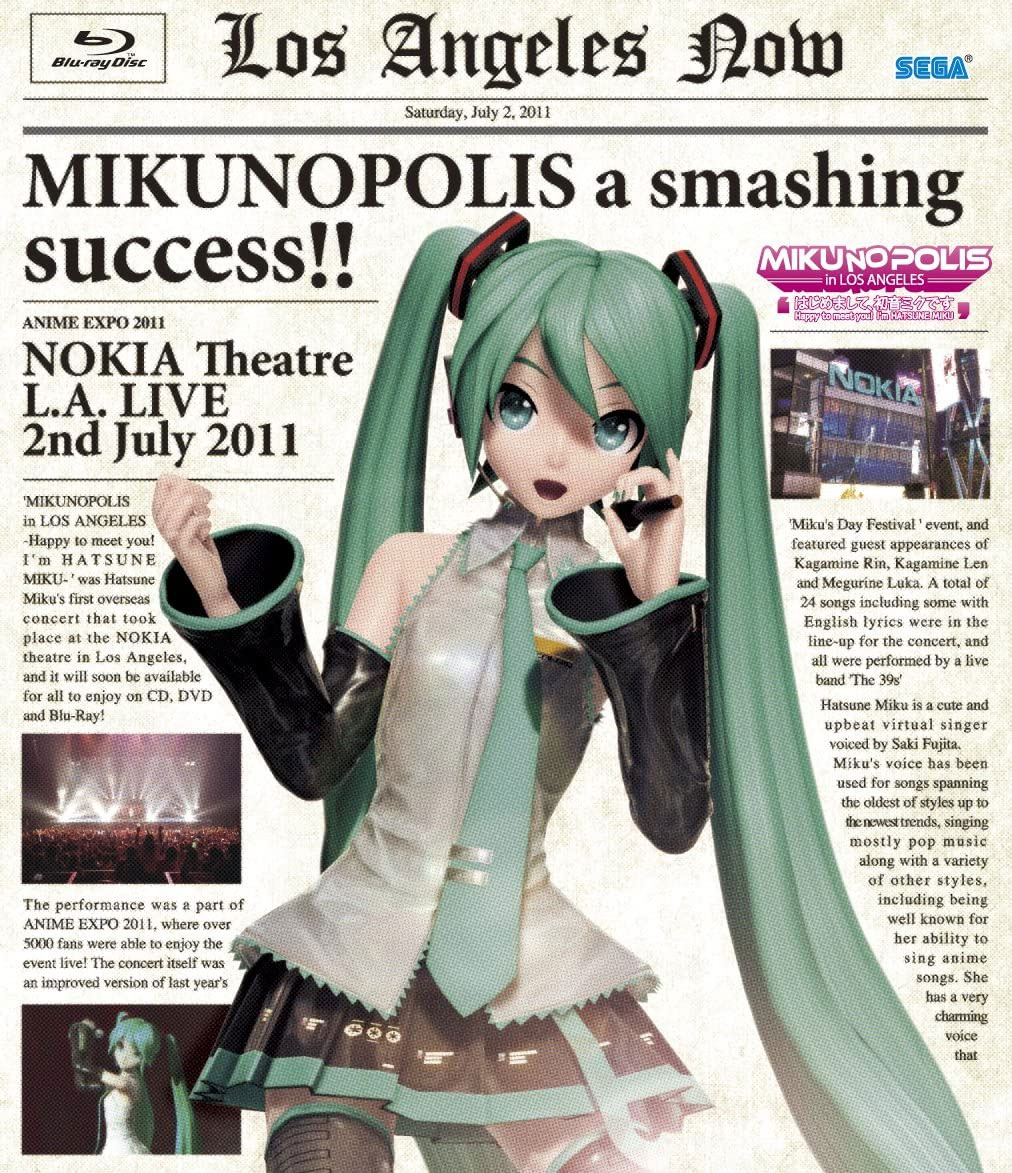 2011年7月2日(美国时间),(MIKUNOPOLIS in LOS ANGELES)世嘉公司在美国洛杉矶举行的初音演唱会圆满落幕!由于再次由SEGA负责影像担当,并且以2010年的初音感谢祭为基础,所以全息投影技术得以回归!相对于2010年初音感谢祭,登场角色依然为初音、双子和巡音,共演唱了24首歌曲,而初音的换装则都为新服饰!这次洛杉矶初音演唱会,其预售票2周之内就全部卖完,到场人数也多达6000人,现场的美国初音迷们气氛也十分火热,不愧是风靡世界的虚拟偶像~