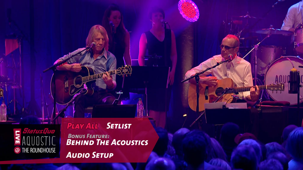 BBC Radio 2 broadcast this special ‘Aquostic’ performance live, and the footage was made available on the night on ‘red button’ and was the BBC’s highest-rated programme with over a million views in just five days. Now, with the release of ‘Aquostic! Live At The Roundhouse ‘, it is available for Quo fans to own. 2015 sees Francis Rossi, Rick Parfitt, Andrew Bown, John ‘Rhino’ Edwards and Leon Cave building on the incredible momentum that ‘Aquostic’ has generated. Classic Rock said of this show, “It was triumphant”, adding, “It works. Brilliantly. Quo acoustic? It’s no gimmick “. The DVD and Blu-ray formats will feature bonus behind the scenes material.
