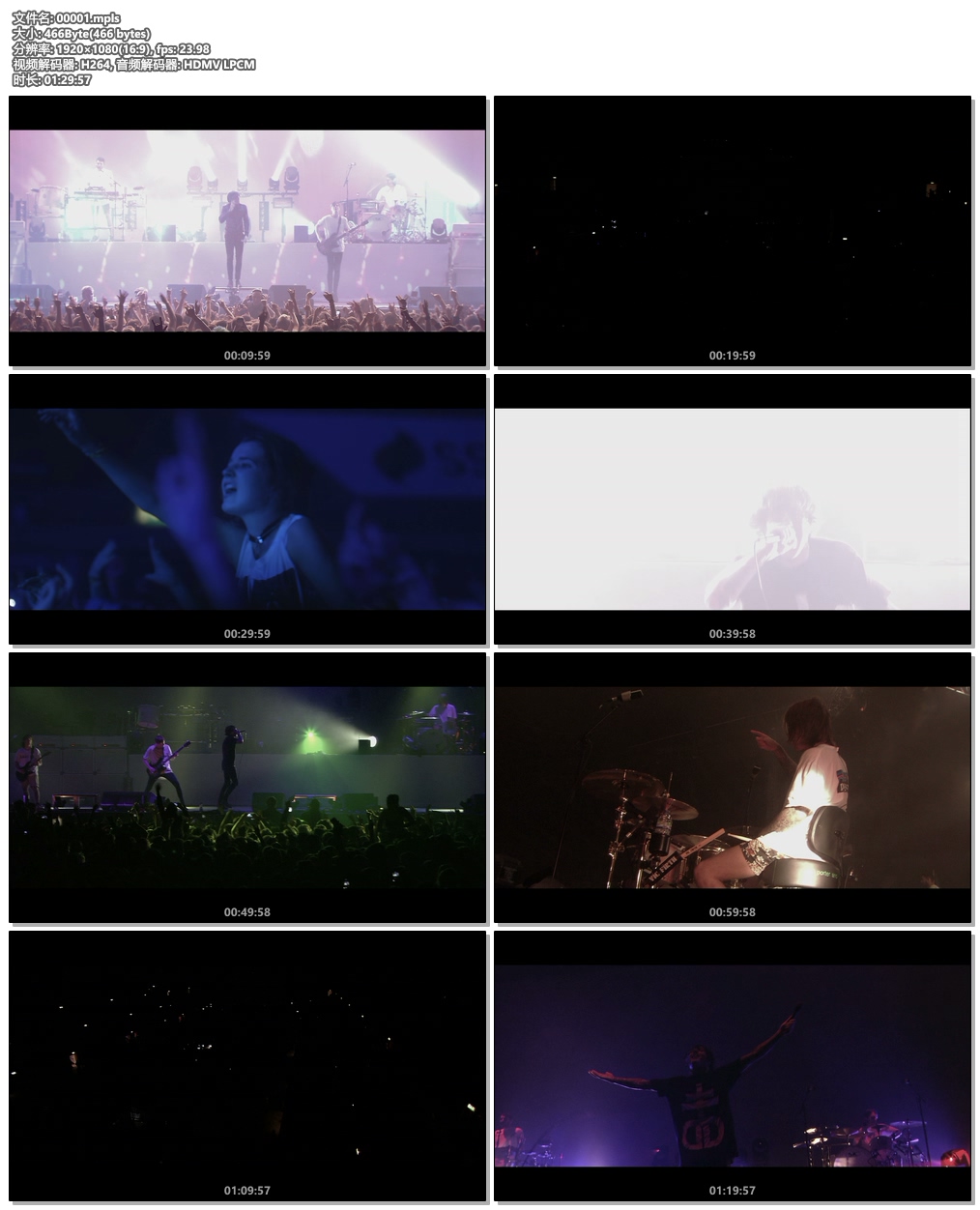 DISC INFO: Disc Title: Bring.Me.The.Horizon.Live.At.Wembley.Arena.2015.COMPLETE.MBLURAY-FKKHD Disc Size: 23 810 790 235 bytes Protection: AACS BD-Java: No BDInfo: 0.5.8 PLAYLIST REPORT: Name: 00001.MPLS Length: 1:29:57.016 (h:m:s.ms) Size: 21 627 230 208 bytes Total Bitrate: 32,06 Mbps VIDEO: Codec Bitrate Description ----- ------- ----------- MPEG-4 AVC Video 24999 kbps 1080p / 23,976 fps / 16:9 / High Profile 4.1 AUDIO: Codec Language Bitrate Description ----- -------- ------- ----------- DTS-HD Master Audio English 3069 kbps 5.1 / 48 kHz / 3069 kbps / 24-bit (DTS Core: 5.1 / 48 kHz / 1509 kbps / 24-bit) LPCM Audio English 2304 kbps 2.0 / 48 kHz / 2304 kbps / 24-bit FILES: Name Time In Length Size Total Bitrate ---- ------- ------ ---- ------------- 00001.M2TS 0:00:00.000 1:29:57.016 21 627 230 208 32 058 --------------------------------- Bring.Me.The.Horizon.Live.at.Wembley.Arena.2015.RERiP.720p.MBluRay.x264-FKKHD rls info rel.date...31/07/2015 store.date.24/07/2015 menu.......None subs.......None extras.....None L genre......Metal ] format.....mkv video......1280x544 @ 5451 kbps audio......DTS 5.1 @ 1509 kbps size.......91 x 50 MB playtime...01:29:00 ] source.....Bluray more info --------------------------------- Bring.Me.The.Horizon.Live.at.Wembley.Arena.2015.1080p.MBluRay.x264-FKKHD rls info rel.date...31/07/2015 store.date.24/07/2015 menu.......None subs.......None extras.....None L genre......Metal ] format.....mkv video......1920x816 @ 8917 kbps audio......DTS 5.1 @ 1509 kbps size.......68 x 100 MB playtime...01:29:00 ] source.....Bluray more info http://www.amazon.de/dp/B00U6SWA40
