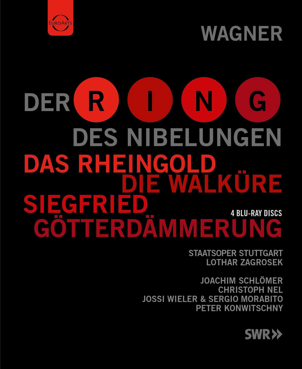 As a special Christmas offer, Euroarts presents the hugely successful Ring cycle from the Staatsoper Stuttgart in a box set. The prologue Rheingold and all three subsequent nights (Walküre, Siegfried, Götterdämmerung) of the “stage festival”, as Wagner put it, will be cherished by Wagner enthusiasts and lovers of great theatre all over the world. “Four operas – four stage directors” was the artistic idea behind the 1999/2000 cycle in Stuttgart. Their focus on the individual operas of “Der Ring des Nibelungen” rather than the cycle enabled the stage directors – handpicked by the successful Stuttgart Opera team surrounding Artistic Director Klaus Zehelein – to express their individual insights into the well-known drama of Siegfried and Wotan . Audiences, Wagnerians, and music critics alike were all enthusiastic about the result. As the Financial Times said: “At a time when most are struggling to find something new to say about Wagner, Zehelein shattered convention by allocating the four operas to four different production teams. The results are astonishing as much for the unexpected harmony of the different approaches as for the strength of their diverse insights. Thus deconstructed, Wagner is less totalitarian, more dramatic. The Ring finally looks politically and psychologically modern again. “Directors Joachim Schlömer, Christoph Nel, Jossi Wieler and Peter Konwitschny and their outstanding cast (Angela Denoke, Luana DeVol, Lisa Gasteen, Robert Gambill, Jan-Hendrik Rootering, Wolfgang Schöne, Jon Frederick West et al.) managed an epoch-making artistic enterprise, which will maintain its place as a highlight of Wagner staging for years to come.