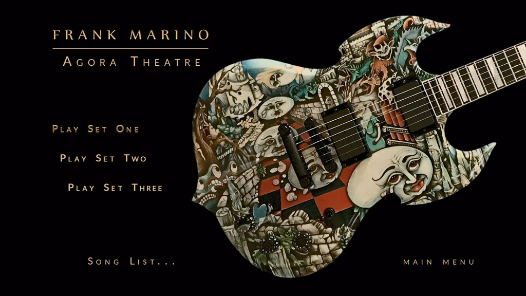 “If you’ve never heard Frank Marino play live, you’ve never heard Frank Marino. Now, with this Live Concert Performance filmed at the storied Agora Theater in Cleveland Ohio, not only will you hear him but you will experience it as if you were right there. Absolutely stunning FID camera shots, close-ups and angles directed by two-time Emmy Award nominee Chris Hilson, director of numerous Bruce Springsteen videos, along with impeccable FID audio-production produced by Marino himself, this concert-performance represents the very best of the legendary rock-guitarist. From songs to jams, hard-rock to ballads, blues to jazz and the simple to outright psychedelia, this concert encompasses almost six hours of the very best of this multitalented and unique iconic player.”