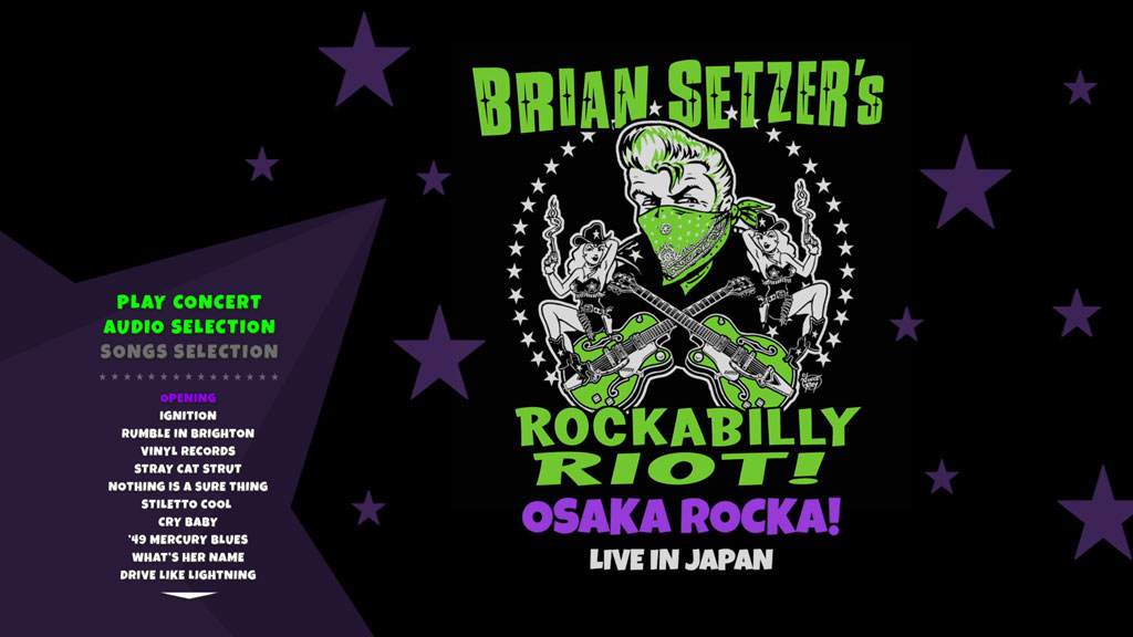 Three-time Grammy-award-winner BRIAN SETZER’s new concert Blu-ray/CD, ROCKABILLY RIOT: OSAKA ROCKA! – LIVE IN JAPAN–filmed on February 18 at Namba Hatch in Osaka, Japan–is set for release November 4, 2016 via Surfdog Records. Live and loud, the concert encompasses songs from SETZER’s acclaimed 2014 studio album Rockabilly Riot! All Original—a sizzling rockabilly album from start to finish featuring SETZER’s trademark twang and fretboard fire. Also included are classic hits from his Stray Cats days, Brian Setzer Orchestra tunes and tracks from his solo albums. In front of the wildly enthusiastic audience, Brian Setzer and his band—Noah Levy (Drums), Kevin McKendree (Piano and Guitar) and Mark Winchester (Bass)—are firing on all cylinders.