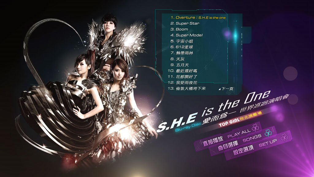 ◎S.H.E IS THE ONE爱而为一世界巡迴演唱会 TOP GIRL 台北旗舰场:S.H.E出道10年自我突破、最精彩的纪念献礼,经典名曲一次听到爽,完整收藏总长超过三小时之幕前华丽演出。