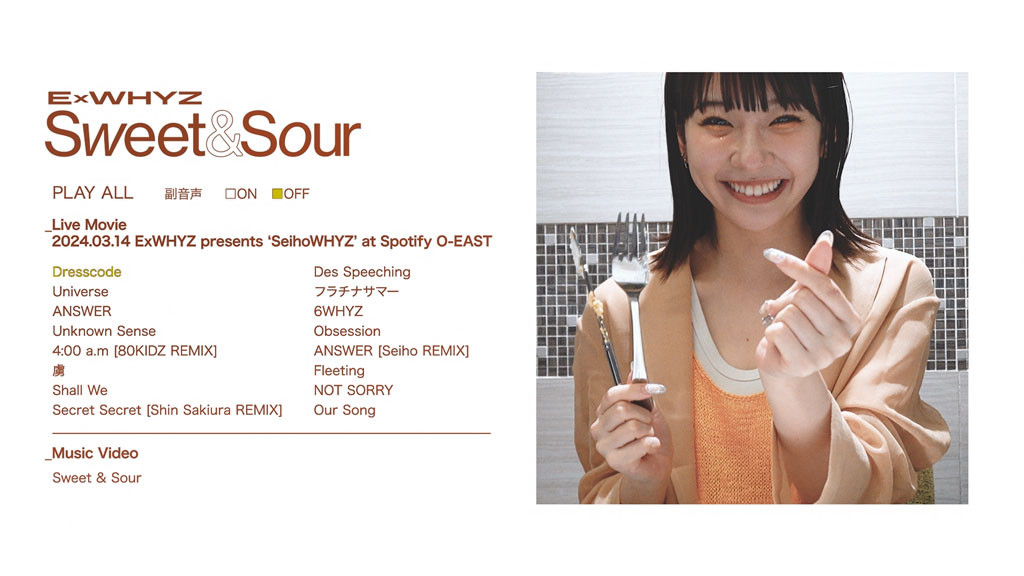 サウンドプロデューサー/DJのSeihoとのスプリットツアー(全公演完売)、5月からスタートする19都市20公演の全国ツアーを経て、「Sweet」と「Sour」のテーマに、現在のExWHYZのLIVEフロアが放つ’多幸感’を独自の”POP”で解釈した5曲入り2nd EP!!