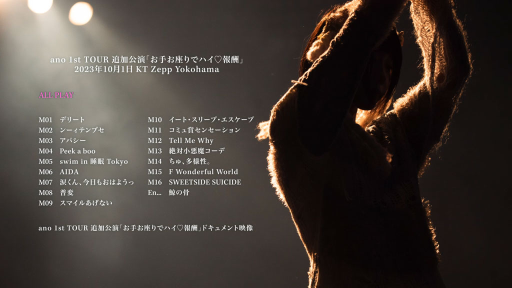初回生産限定盤には2023年10月1日に開催された”ano 1st TOUR 追加公演「お手お座りでハイ?報酬ツアー」at KT Zepp Yokohama”のBlu-rayを収録。