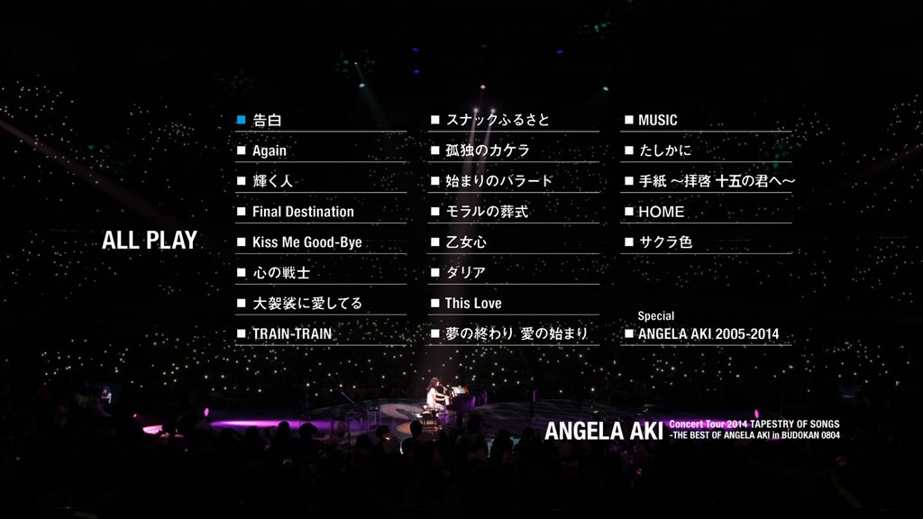 2014年8月4日,日本創作鋼琴歌姬Angela Aki在武道館360度的舞台上迎接了一萬四千人的歌迷,舉行了活動休止前的最後一場公演。2005年出道以來便以招牌的牛仔褲及黑框眼鏡還有鋼琴伴奏的動人歌曲篤定了自己在歌壇內地位的Angela Aki,十年來創作出了無數的名曲,並於2006年舉行了武道館史上第一次的鋼琴自彈自唱演唱會。累積了十年的音樂經驗這一晚完全釋放,帶給歌迷們最難以忘懷、最純粹的Angela Aki!