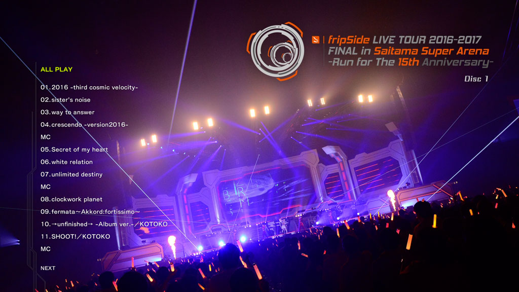 2017年3月18日(土)、さいたまスーパーアリーナにて行われた「fripSide LIVE TOUR 2016-2017 FINAL in Saitama Super Arena -Run for the 15th Anniversary-supported by animelo mix」の映像がリリース!Blu-ray初回限定版type-A VRスコープ付。
