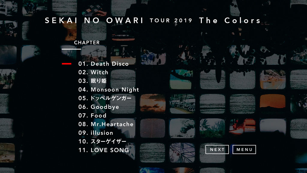 SEKAI NO OWARIの2019年ツアーから7月24日と25日に行われた幕張メッセ国際展示場公演を映像化。「Death Disco」「Monsoon Night」「ドッペルゲンガー」「スターゲイザー」「蜜の月」「MAGIC」「スターライトパレード」ほか、全20曲を収録。
