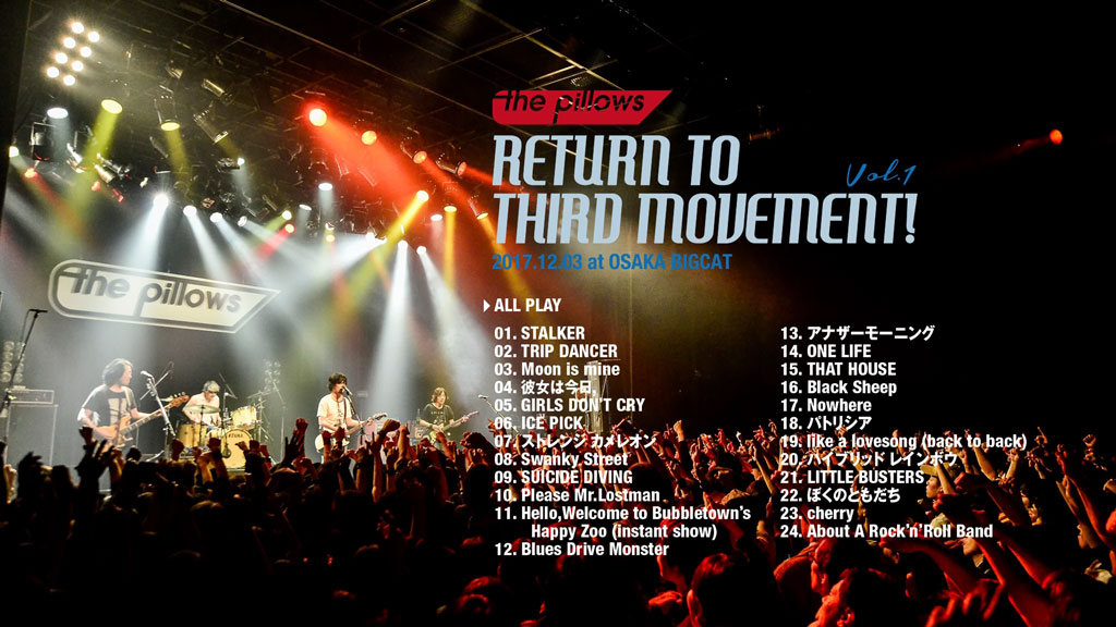 The tour “RETURN TO THIRD MOVEMENT! Vol.1” which consists of all the songs from the two albums, the 5th album “Please Mr. Lostman” released in 1997 and the 6th album “LITTLE BUSTERS” released in 1998, at the beginning of The Pillows‘ “3rd period” in 2017. From the tour “RETURN TO THIRD MOVEMENT! Vol.1” that consisted of all the songs from the two albums “Please Mr. Lostman” released in 1997 and “LITTLE BUSTERS” released in 1998, the live performance that took place at Osaka BIGCAT on December 3, 2017 was recorded.
