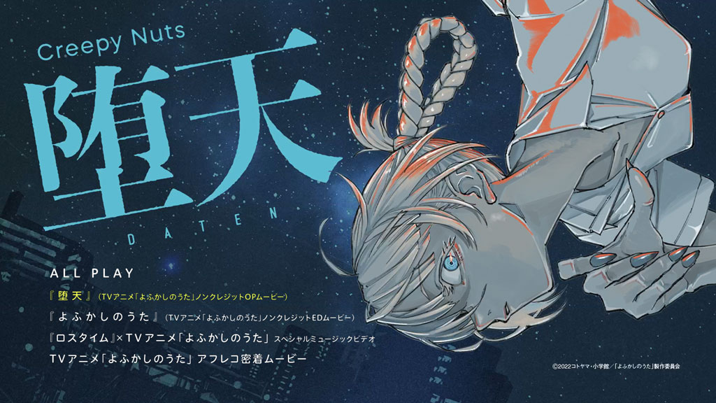 「堕天」はCreepy Nutsの楽曲をもとにタイトルが付けられた人気同名マンガをアニメ化した『よふかしのうた』のために書き下ろされた新曲で、心地よく疾走するジャズテイストでクールなトラックに乗せて、人が恋に”堕ちて”いくような、抗えず何かにハマって行く人間の感情を描いた注目のキラーチューン! ED「よふかしのうた (Remastered)」も収録。Blu-rayには『堕天』ノンクレジットOPムービー、「よふかしのうた」ノンクレジットEDムービー、『ロスタイム』×TVアニメ「よふかしのうた」スペシャルミュージックビデオ他を収録予定。 ※2022年12月31日までの期間生産限定盤