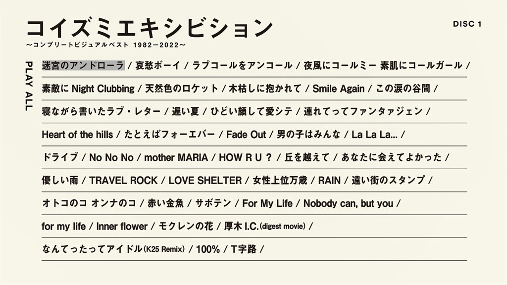 小泉今日子デビュー40周年。2017年にリリースされた音源ベスト「コイズミクロニクル 」に続き、今回はビジュアル版のベストアルバムともいえる、その名も「コイズミエキシビション」。今まで制作されたミュージックビデオを完全収録。新たにデジタルアップコンバートされた映像とリマスタリング音源でアップデートされた小泉今日子40年の全記録! 初回限定盤には2大特典として、未発表含むライブ映像や現在入手困難のデビュー当時の貴重なドキュメンタリー映像「ドキュメント〜走りつづけるミスヒーロー今日子〜」(初DVD&Blu-ray化)を収録したボーナスディスクが付属。さらに当時の貴重な写真や小泉今日子へのインタビューに加え、フォトグラファー、スタイリストなど、日本のポップカルチャーのアイコンとなった小泉今日子のファッションやビジュアルを支えたクリエイターたちへのインタビューも収録された豪華大型ビジュアルブックが付属される永久保存版仕様となる。