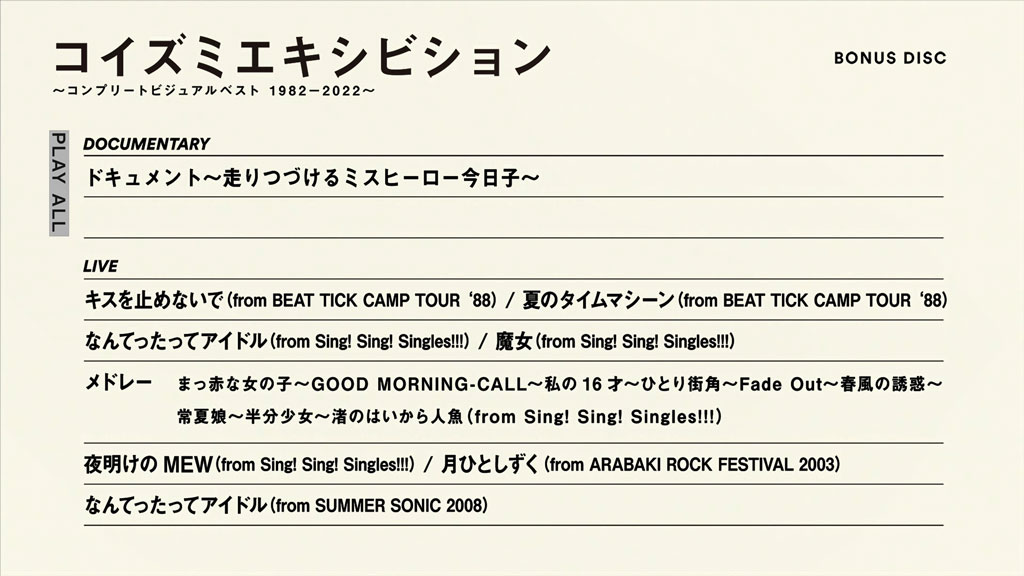 小泉今日子デビュー40周年。2017年にリリースされた音源ベスト「コイズミクロニクル 」に続き、今回はビジュアル版のベストアルバムともいえる、その名も「コイズミエキシビション」。今まで制作されたミュージックビデオを完全収録。新たにデジタルアップコンバートされた映像とリマスタリング音源で、アップデートされた小泉今日子40年の映像全記録。 初回限定盤には2大特典として、ライブ映像や現在入手困難となっているデビュー当時の貴重なドキュメンタリー映像「ドキュメント~走りつづけるミスヒーロー今日子~」(初DVD&Blu-ray化)を収録したボーナスディスクが付属。さらに当時の貴重な写真や小泉今日子へのインタビューに加え、フォトグラファー、ファッションデザイナー、スタイリスト、ヘアメイク、映像クリエイターなど、日本のポップカルチャーのアイコンとなった小泉今日子のファッションやビジュアルを支えたクリエイターたちへのインタビューも収録されたビジュアルブック(全86P)が付属。B4サイズ豪華BOXパッケージの永久保存版仕様となる。