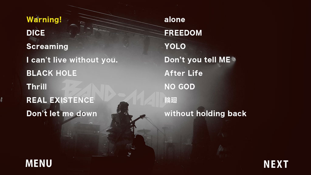 また完全生産限定盤は、マルチチャンネル(各メンバー固定カメラ)映像5曲収録のBlu-ray、当日初披露されたBAND-MAID OKYU-JI NEW SE「ENTREE」をレコーディングした特別CD、100Pに及ぶ写真集を付属させた豪華BOX仕様。
