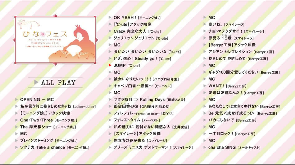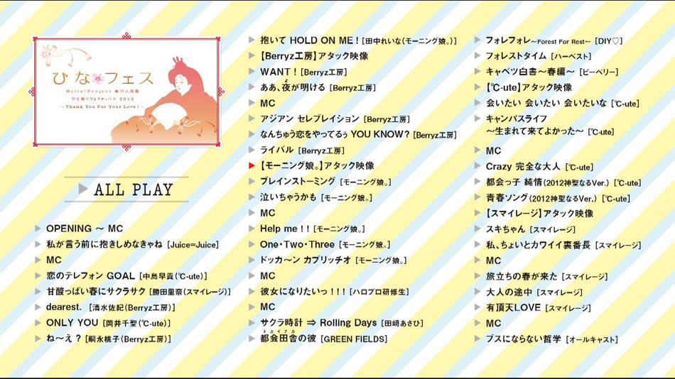 英文片名:Hello! Project 2013 Haru no Dai Kanshasai Hinamatsuri Festival Kanzenban ~Hina Fes.~