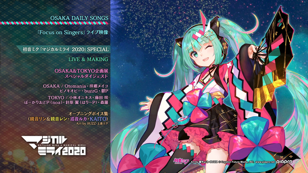 Features the final of “Magical Mirai 2020” held in Tokyo, consisting of three parts. Also includes daily songs performed in Tokyo. This edition comes with a bonus disc featuring performances only shown in Osaka (subject to change) and features special slipcase packaging featuring illustration by Choco Fuji, artwork on “Winter Festival Hatsune Miku” and one featuring MEIKO and Hatsune Miku. Also includes a special book and more.
