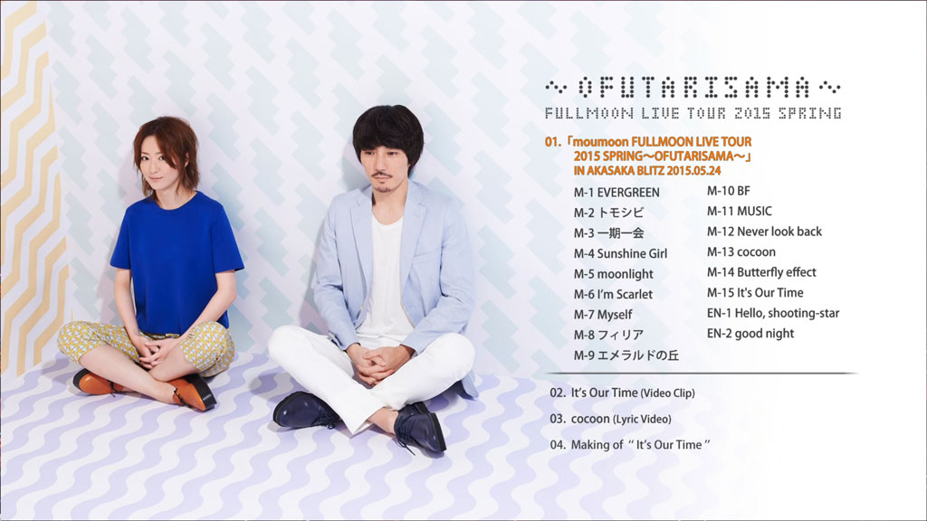 | 1 | [MOUMOON FULLMOON LIVE TOUR 2015 SPRING-OFUTARISAMA-] IN AKASAKA BLITZ 2015.05.24 「moumoon FULLMOON LIVE TOUR 2015 SPRING~OFUTARISAMA~」 IN AKASAKA BLITZ 2015.05.24 |