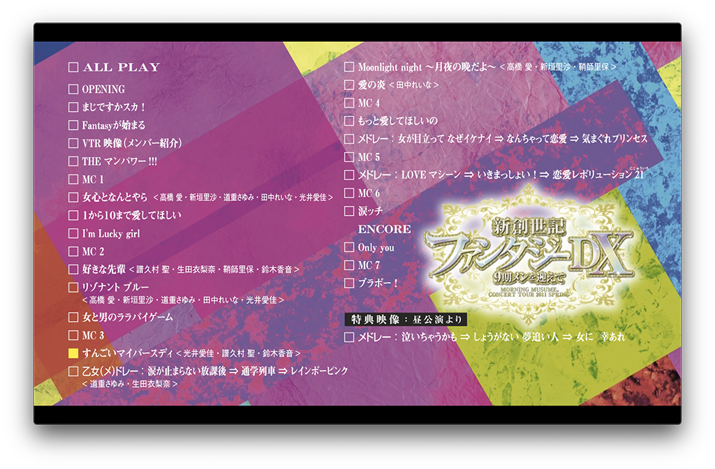 | 23 | メドレー:LOVEマシーン⇒いきまっしょい!⇒恋愛レボリューション21 | 08:37 | ▼ | |||