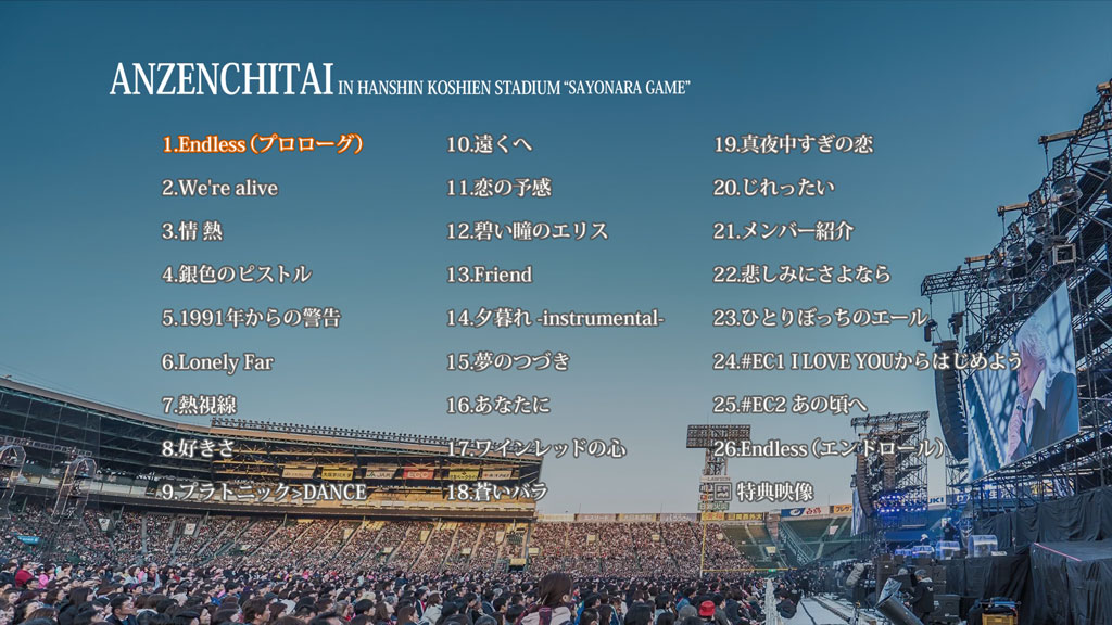 世界中が愛で溢れますように/世界に愛と平和を…V 安全地帯。11月16日の土曜日の午後、全国の野球ファンたちの聖地として知られる阪神甲子園球場にて、安全地帯として初となる公演「安全地帯 IN 甲子園球場 “さよならゲーム”」が行われた。冒頭のメンバーによる公式コメントのV とは、デビュー以来37年に渡って活動をともにしてきた5人のメンバーを意味するもの。ステージ後方のバックスクリーンに掲げられたVと記した5つの旗のもとに約3万8千人の大観衆が集結して行われた今回の公演は、約30年ぶりのスタジアムライブにして、長きキャリアを重ねて進化を続けてきた彼らの集大成を示すステージとなった。時代を超えて音楽シーンの頂点に君臨するロックバンド、安全地帯。玉置浩二自ら「さよならゲーム」と命名した、バンド史上初の甲子園球場ライブの模様を完全収録、ドキュメンタリー映像も加えてファン待望のパッケージ化!!