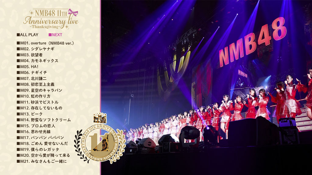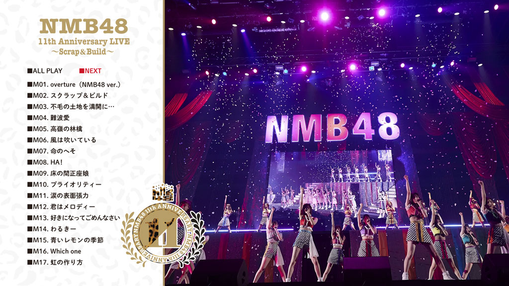 11周年記念コンサートは、1期生が全員卒業し、新たなNMB48を作り上げるために次世代メンバーはもちろん、先輩メンバーも個性を活かしたユニットを披露した「NMB48 11th Anniversary LIVE ~Scrap & Build~」とともに、メンバー全員がセンター曲を披露した「NMB48 11th Anniversary LIVE ~Thanksgiving~」を収録。