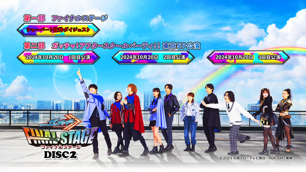 『仮面ライダーガッチャード ファイナルステージ』–/たくさんの『がんばれ』への『ありがとう』を胸に、キャスト&アーティスト【総勢12名】、“仮面ライダーFS”史上最大人数で贈る“虹色の卒業旅行”!/TVシリーズのその後を描く新たなストーリーを、臨場感あふれるショーでお届けする「ファイナルステージ」に加え、キャスト陣による秘話満載のトークとミュージックライブを展開する「ガッチャ!アフタースクールパーティ!!」。/2024年10月19・20日開催の東京公演『仮面ライダーガッチャード ファイナルステージ』/2部構成で贈るイベントの模様を収録!