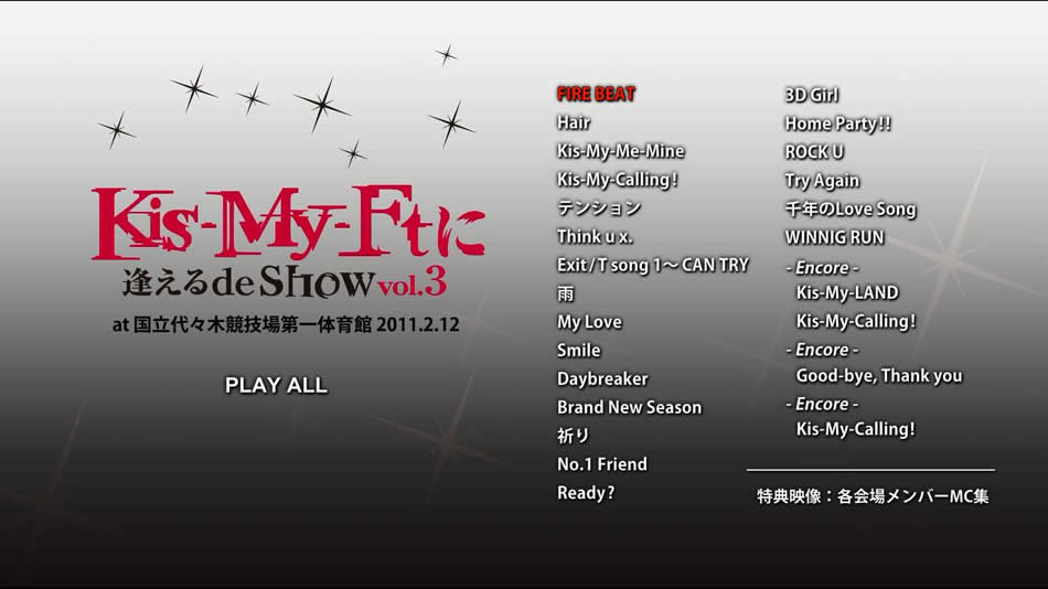 “ジャニーズJr.”のKis-My-Ft2として敢行された最後の単独アリーナツアー「Kis-My-Ftに逢えるde Show vol.3」より、メンバーにサプライズでメジャーデビューが発表された国立代々木第一体育館公演をBD化。特典には各会場のメンバーMC集を収録する。