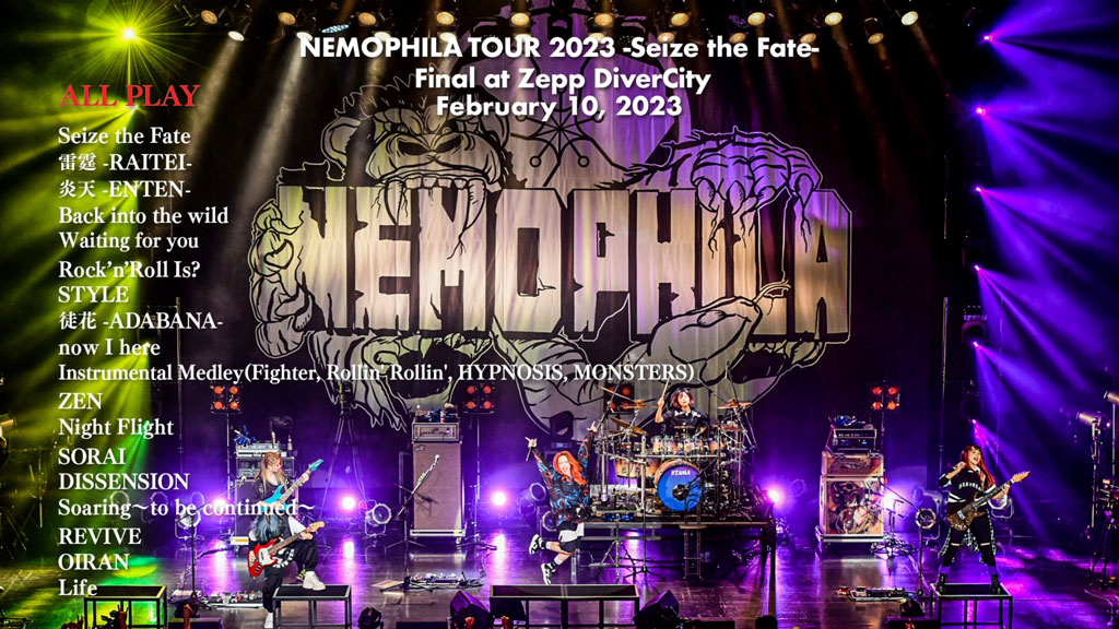 Features the final day of NEMOPHILA‘s first solo tour “NEMOPHILA TOUR 2023 “Seize the Fate” ” held at Zepp DiverCity on February 10, 2023.