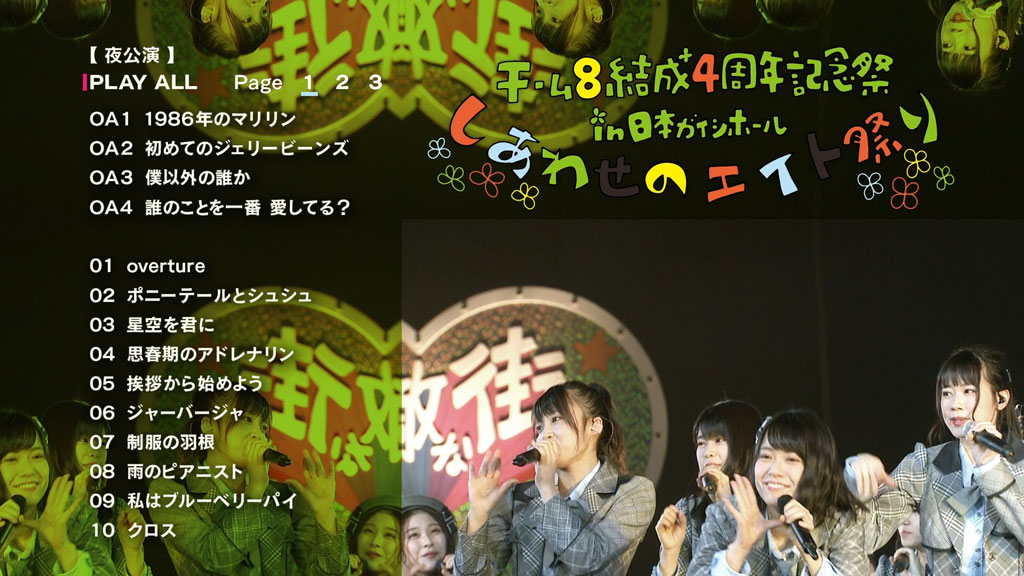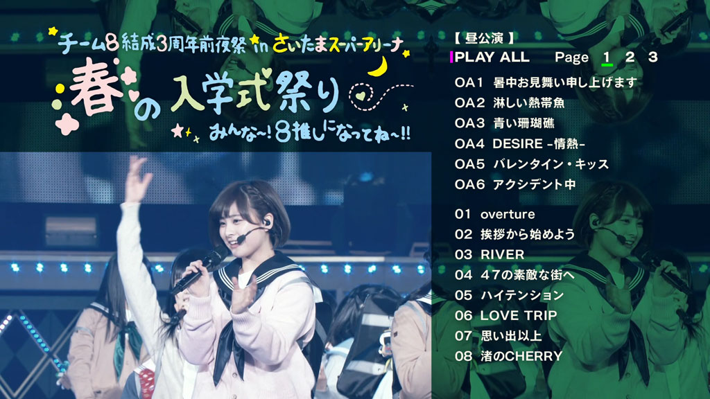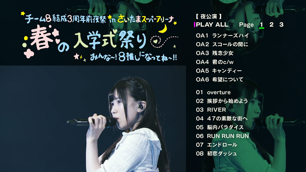 Disc 2 contains Team 8 Kessei 3 Shuunen Zenyasai in Saitama Super Arena 「Haru no Nyuugakushiki Matsuri Minna~! 8 Oshi ni Natte ne~!!」 Yoru Kouen, which was held on April 2, 2017.