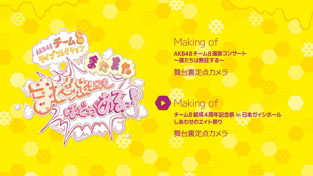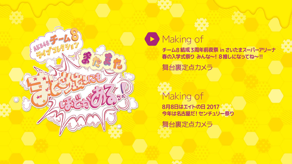 Disc 8 contains Making of Team 8 Kessei 3 Shuunen Zenyasai & 8gatsu 8ka wa Eight no Hi 2017.