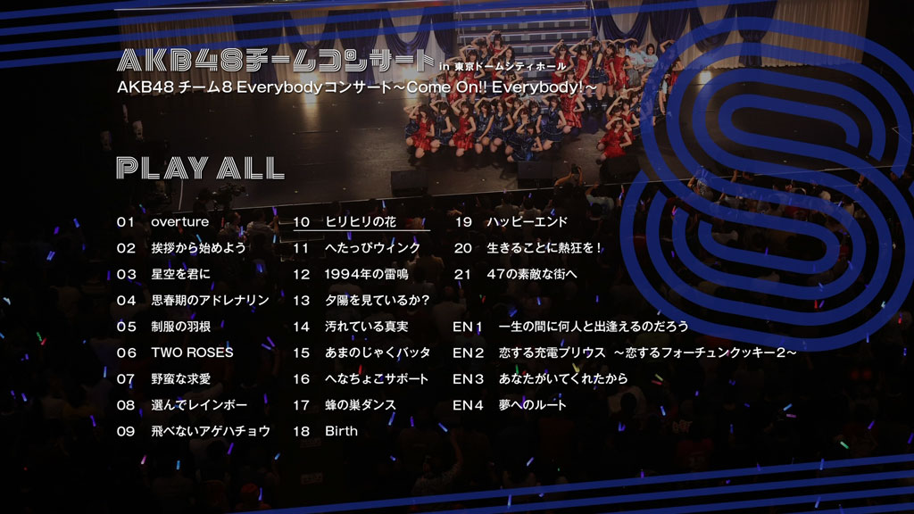 Disc 7 contains AKB48 Team 8 Everybody Concert ~Come On!! Everybody!~, which was held on January 14, 2019.