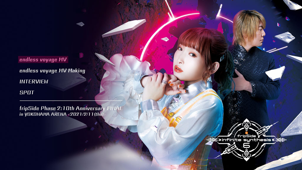 fripSide ニューアルバム「infinite synthesis 6」リリース!! 「endless voyage」(新曲)、「legendary future」(TVアニメ「キングスレイド 意思を継ぐものたち」OPテーマ)、「worlds collide」(とある魔術の禁書目録 幻想収束 第二期オープニングテーマ)、「for seasons」(webアニメ「sapreas」主題歌)を含む、全14曲収録。初回限定盤Blu-rayには、「endless voyage」MV、「endless voyage」MV Maiking、INTERVIEW、SPOT、fripSide Phase 2 : 10th Anniversary FINAL in YOKOHAMA ARENA〈2021/2/11(thu)〉を収録。