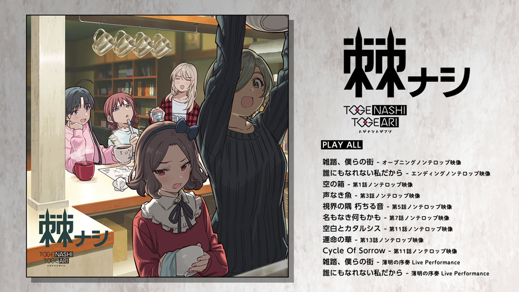 加えてTVアニメ放送前の2024年3月にリアルにて開催されたトゲナシトゲアリ 1st ONE-MAN LIVE “薄明の序奏”より、オープニング主題歌「雑踏、僕らの街」とエンディング主題歌「誰にもなれない私だから」の2曲のLIVE映像も初めて収録される。