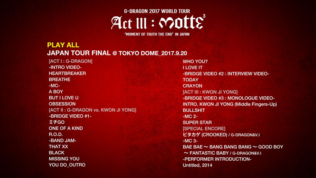 1.DOCUMENTARY OF G-DRAGON 2017 WORLD TOUR <ACT 3, M.O.T.T.E> IN JAPAN