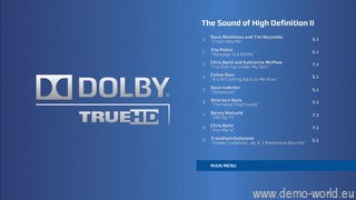 “The Sound Of High Definition II”是杜比推出的第二张以DolbyTrueHD、DolbyDigitalPlus高清音频为内容的蓝光测试碟。内容主要以演唱会、演奏会为主,当中包括CelineDion的《It’s all coming back to me now》以及SanFrancisco Symphony的《The Rite of Spring》等。与第一代的测试碟相比,这张碟更加注重杜比高清音频技术在音乐类方面的表现。