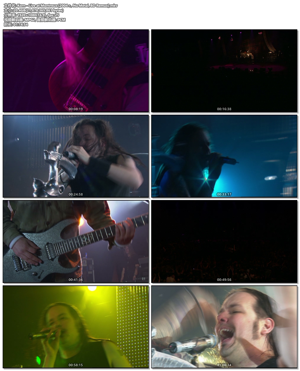 General Unique ID : 178369383612890859528266955886183561640 (0x8630B196BAB109AABC871C2E29CBB9A8) Complete name : K:\Korn - Live at Montreux [2004 г., Nu Metal, BD Remux].mkv\Korn - Live at Montreux [2004 г., Nu Metal, BD Remux].mkv Format : Matroska Format version : Version 2 File size : 20.4 GiB Duration : 1 h 14 min Overall bit rate mode : Variable Overall bit rate : 38.9 Mb/s Movie name : Korn - Live at Montreux [2004 г., Nu Metal, BD Remux] Encoded date : UTC 2012-01-22 19:57:47 Writing application : mkvmerge v5.2.1 ('A Far Off Place') built on Jan 2 2012 23:21:10 Writing library : libebml v1.2.3 + libmatroska v1.3.0 Video ID : 1 Format : MPEG Video Format version : Version 2 Format profile : Main@High Format settings : BVOP Format settings, BVOP : Yes Format settings, Matrix : Default Format settings, picture struc : Frame Codec ID : V_MPEG2 Codec ID/Info : MPEG 1 or 2 Video Duration : 1 h 14 min Bit rate mode : Variable Maximum bit rate : 27.0 Mb/s Width : 1 920 pixels Height : 1 080 pixels Display aspect ratio : 16:9 Frame rate mode : Constant Frame rate : 25.000 FPS Standard : PAL Color space : YUV Chroma subsampling : 4:2:0 Bit depth : 8 bits Scan type : Interlaced Scan order : Top Field First Compression mode : Lossy Time code of first frame : 00:00:00:00 Time code source : Group of pictures header GOP, Open/Closed : Closed Title : Korn - Live at Montreux [2004 г., Nu Metal, BD Remux] Language : English Default : Yes Forced : No Color primaries : BT.709 Transfer characteristics : BT.709 Matrix coefficients : BT.709 Audio #1 ID : 2 Format : PCM Format settings : Little / Signed Codec ID : A_PCM/INT/LIT Duration : 1 h 14 min Bit rate mode : Constant Bit rate : 1 536 kb/s Channel(s) : 2 channels Sampling rate : 48.0 kHz Bit depth : 16 bits Stream size : 823 MiB (4%) Title : PCM [2.0 CH] Language : English Default : Yes Forced : No Audio #2 ID : 3 Format : MLP FBA Format/Info : Meridian Lossless Packing FBA Commercial name : Dolby TrueHD Codec ID : A_TRUEHD Duration : 1 h 14 min Bit rate mode : Variable Maximum bit rate : 5 148 kb/s Channel(s) : 6 channels Channel layout : L R C LFE Ls Rs Sampling rate : 48.0 kHz Frame rate : 1 200.000 FPS (40 SPF) Bit depth : 24 bits Compression mode : Lossless Title : Dolby True HD [5.1 CH] Language : English Default : No Forced : No Audio #3 ID : 4 Format : AC-3 Format/Info : Audio Coding 3 Commercial name : Dolby Digital Codec ID : A_AC3 Duration : 1 h 14 min Bit rate mode : Constant Bit rate : 448 kb/s Channel(s) : 6 channels Channel layout : L R C LFE Ls Rs Sampling rate : 48.0 kHz Frame rate : 31.250 FPS (1536 SPF) Compression mode : Lossy Stream size : 240 MiB (1%) Title : AC3 Embedded [5.1 CH] Language : English Service kind : Complete Main Default : No Forced : No Audio #4 ID : 5 Format : DTS XLL Format/Info : Digital Theater Systems Commercial name : DTS-HD Master Audio Codec ID : A_DTS Duration : 1 h 14 min Bit rate mode : Variable Channel(s) : 6 channels Channel layout : C L R Ls Rs LFE Sampling rate : 48.0 kHz Frame rate : 93.750 FPS (512 SPF) Bit depth : 24 bits Compression mode : Lossless Title : DTS HD Master [3/2+1 CH] Language : English Default : No Forced : No Audio #5 ID : 6 Format : DTS Format/Info : Digital Theater Systems Codec ID : A_DTS Duration : 1 h 14 min Bit rate mode : Constant Bit rate : 1 509 kb/s Channel(s) : 6 channels Channel layout : C L R Ls Rs LFE Sampling rate : 48.0 kHz Frame rate : 93.750 FPS (512 SPF) Bit depth : 24 bits Compression mode : Lossy Stream size : 808 MiB (4%) Title : DTS Core [3/2+1 CH] Language : English Default : No Forced : No Menu 00:00:31.000 : Right Now 00:04:20.000 : Break Some Off 00:07:10.000 : Got The Life 00:11:43.000 : Here To Stay 00:16:32.000 : Falling Away From Me 00:21:09.000 : Blind 00:26:23.000 : Shoots And Ladders 00:31:01.000 : One 00:31:57.000 : Freak On A Leash 00:36:17.000 : Improvisation 00:37:37.000 : A.D.I.D.A.S. 00:40:12.000 : Dead Bodies Everywhere 00:46:05.000 : Did My Time 00:50:15.000 : Another Brick In The Wall 00:56:50.000 : Faget 01:02:33.000 : Somebody Someone 01:08:18.000 : Y'All Want A Single