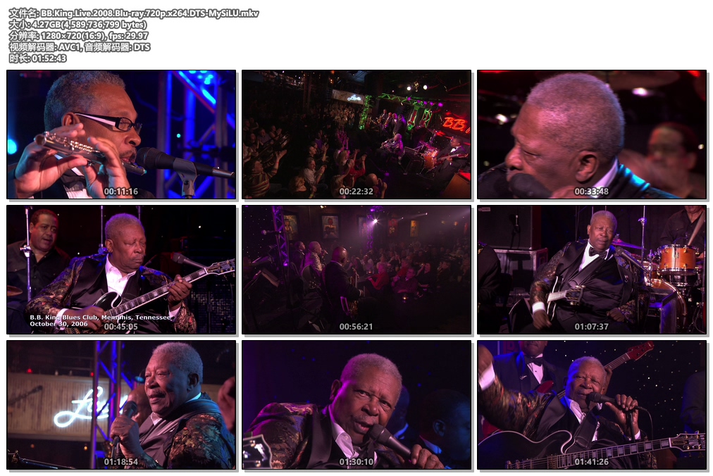 传奇巨星B.B.King纵横流行乐坛已逾半个世纪,他发行过超过50张脍炙人口的经典专辑,光荣入列蓝调名人堂与摇滚名人堂、并获颁格莱美“终生成就奖”。为了特别感谢蓝调之王B.B.King为美国音乐所做出的杰出贡献,美国总统布什亲自为B.B.King颁发了美国最高的国民荣誉奖“Presidential Medal of Freedom——总统自由勋章”。本视频是2006年10月末,B.B.King及其乐队在美国田纳西州纳什维尔和孟菲斯的两家著名的B.B.King蓝调俱乐部进行了13年来首次俱乐部现场演出录制。视频里面拍摄了不同天数的夜间表演,最后集结发布。