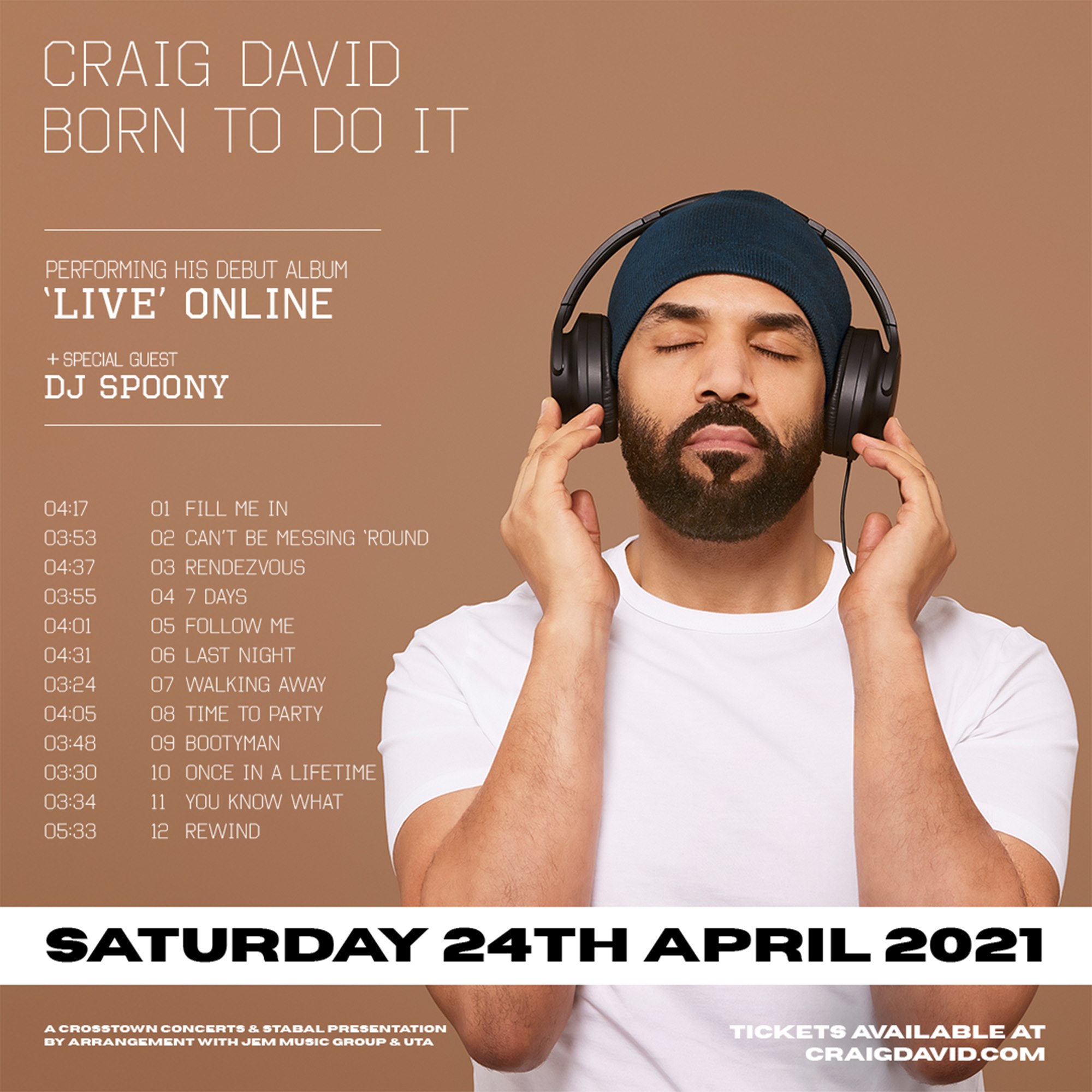 Craig David2021年因为疫情无法举办巡演,为了回馈歌迷,回顾21年的演唱生涯,特意举办了一个【Born To Do It】在线演唱会,完整演唱了首专里的所有歌曲,还特别增加了他挚爱的未发行单曲【Four Times A Lady】【Key To My Heart】【Human】以及【Fill Me In】【7 Days】【Walking Away】等热门单曲的混音版,还发布了演出前采访,和演出排练花絮等。