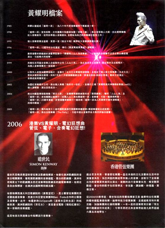 黄耀明与港乐合作的四场演唱会经已在红馆揭开序幕。难得与80人大乐队合作,难免令明哥心情紧张,首晚演出中,亦有点失准。向来形象多变的明哥,当晚特别造了多套不同的服饰,配以不同的化妆出场,其中有二郎神造型、军人look、彩蓝雨衣、运动装、dior最新款的礼服等,个个造型各有味道,其中运动的造型,原来有流血的效果,岂料换衫过急的关系,明哥踩断线的关系,流血效果最后做不到,令明大感失望。当晚明哥唱了一半自己歌曲外,亦唱了一半别人的歌曲,包括梅艳芳、王菲、彭羚、徐小凤、林子祥的作品,最后他以一曲『南方舞厅』结束这夜的演唱会。
