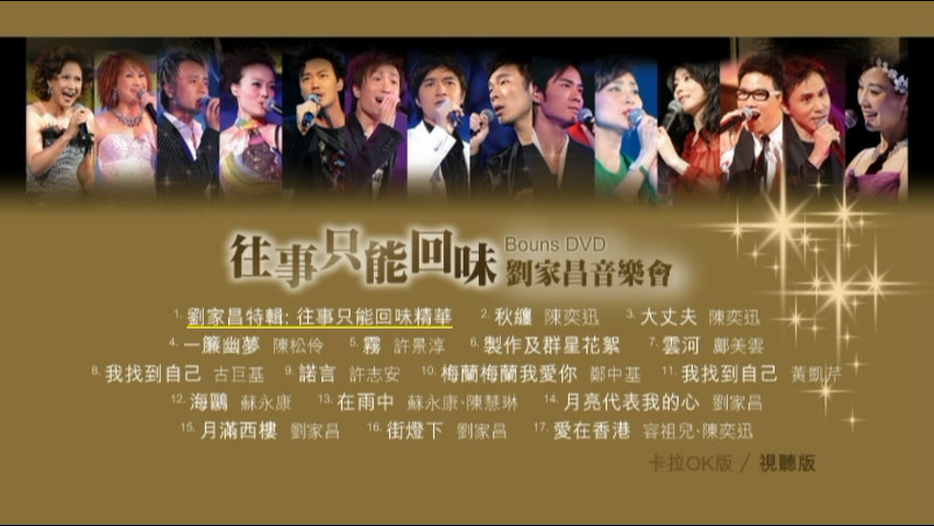 群星 – 往事只能回味刘家昌音乐会 Bonus DVD(DVD/ISO/7.7G) 香港演唱会华人音乐才子刘家昌2006年重出江湖,刘氏的创作作品影响甚广,他创作的《庭院深深》、《小丑》、《云河》等电影主题歌家喻户晓,甄妮、凤飞飞、张艾嘉、费玉清、陈淑桦等歌手都因演唱刘家昌的歌曲而一举成名。“往事只能回味———刘家昌音乐会”1日晚在香港红磡体育馆登场,音乐会开始后,一身黑色西装的刘家昌独唱了《我俩在一起》等歌曲。之后,他的得意弟子尤雅和甄妮先后出场,成龙、陈奕迅、许志安、郑中基、刘德华、李克勤、任贤齐、容祖儿等的出现使音乐会星光熠熠。 资源下载下载价格10 金币立即购买刘家昌往事只能回味演唱会
