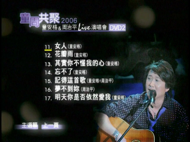 《童周共聚:童安格&周治平2006演唱会》双DVD完整呈现该演唱会盛况,后制的特殊5.1音效处理!在台湾,平均每六个人里就有一个人曾经买过他们的专辑;至于在KTV里点播演唱他们作品或是他们制作歌曲的次数更是天文数字……