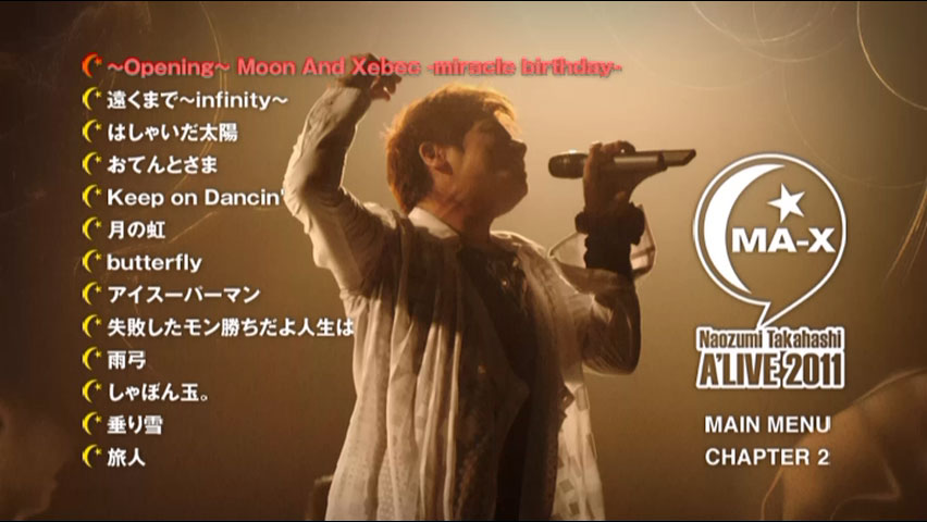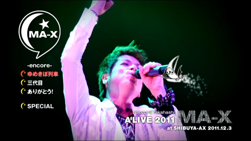 Singer/seiyuu/actor Naozumi Takahashi‘s 14th live DVD, released on April 6, 2012. Includes complete footage of the ‘MA-X’ tour final held at SHIBUYA-AX on December 3, 2011, as well as the usual sorts of extra features (commentary clips, kiai ire, etc.), plus a few performances from a prior date of the tour included as a hidden bonus.