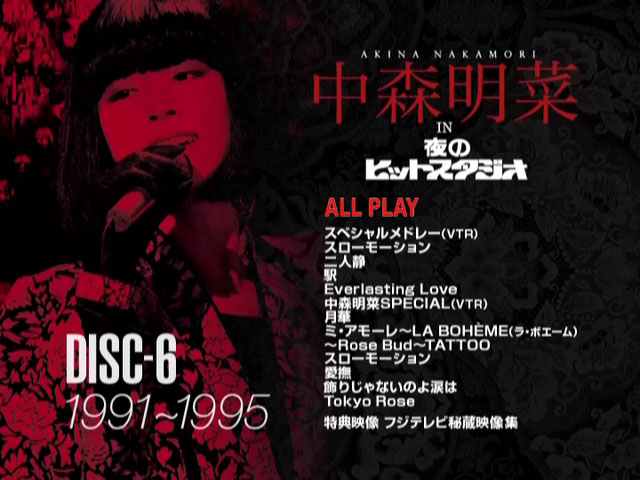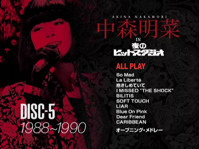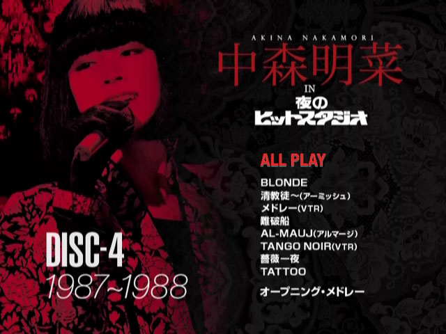中森明菜をスーパースターへと押し上げた伝説的音楽番組 フジテレビ 「中森明菜 in 夜のヒットスタジオ」 DVD化 ! 大ヒット曲 「DESIRE-情熱-」 「TATOO」 「難破船」 を始めとして歌謡史に残る伝説のパフォーマンスを披露した“歌姫”中森の貴重な映像を8時間にわたり収録した完全保存版。 出演の度に話題になる衣装、シングルB面曲やアルバム収録曲、恒例のオープニング・メドレーの歌唱シーンも収録! 数々の賞に輝いた1984~1988年のFNS歌謡祭の貴重な映像をダイジェストで収録。 1982年「少女A」での初出演から1995年「’95夜のヒットスタジオ超X’masスペシャル」までの出演シーンから貴重な映像を収録。